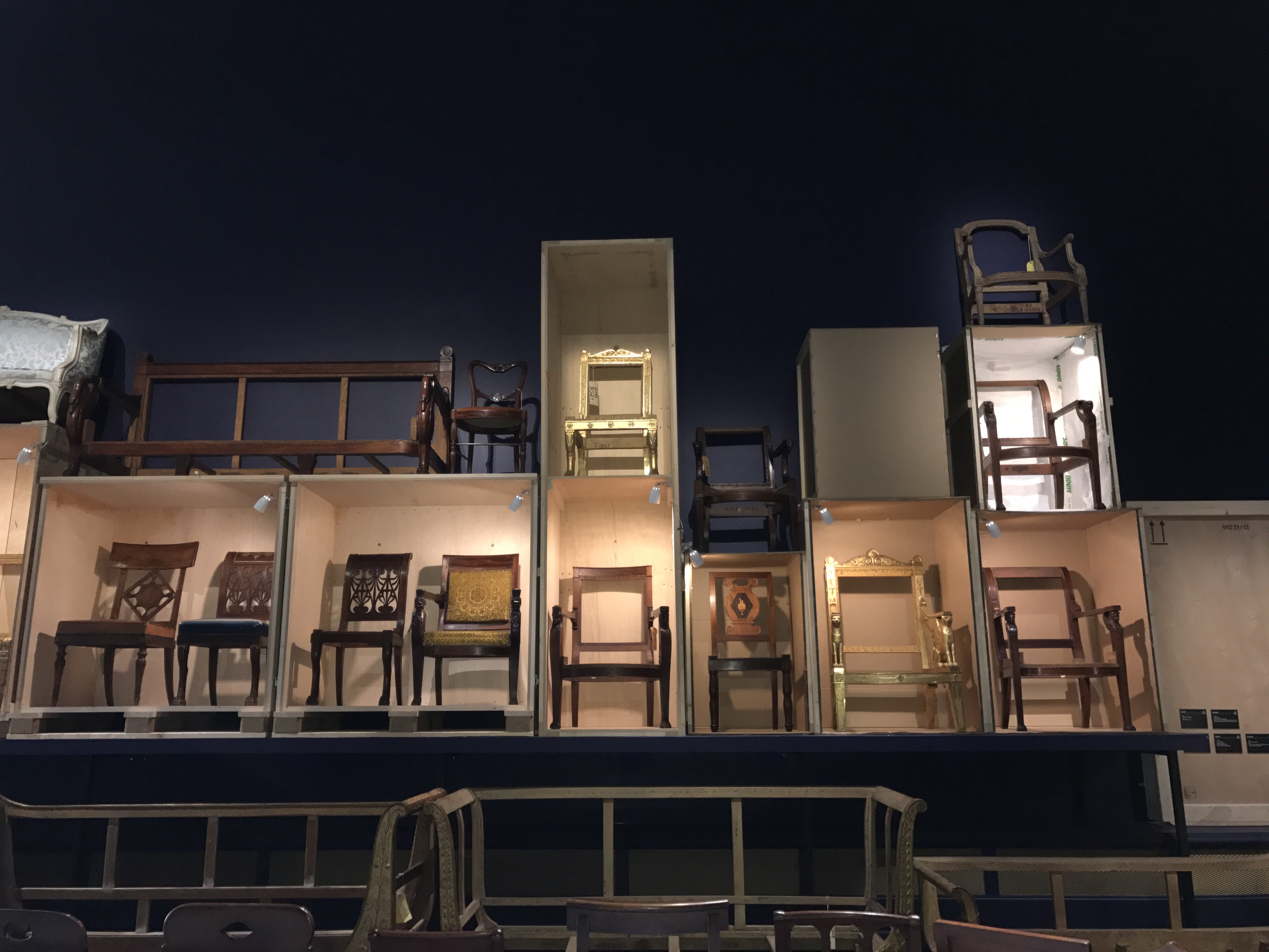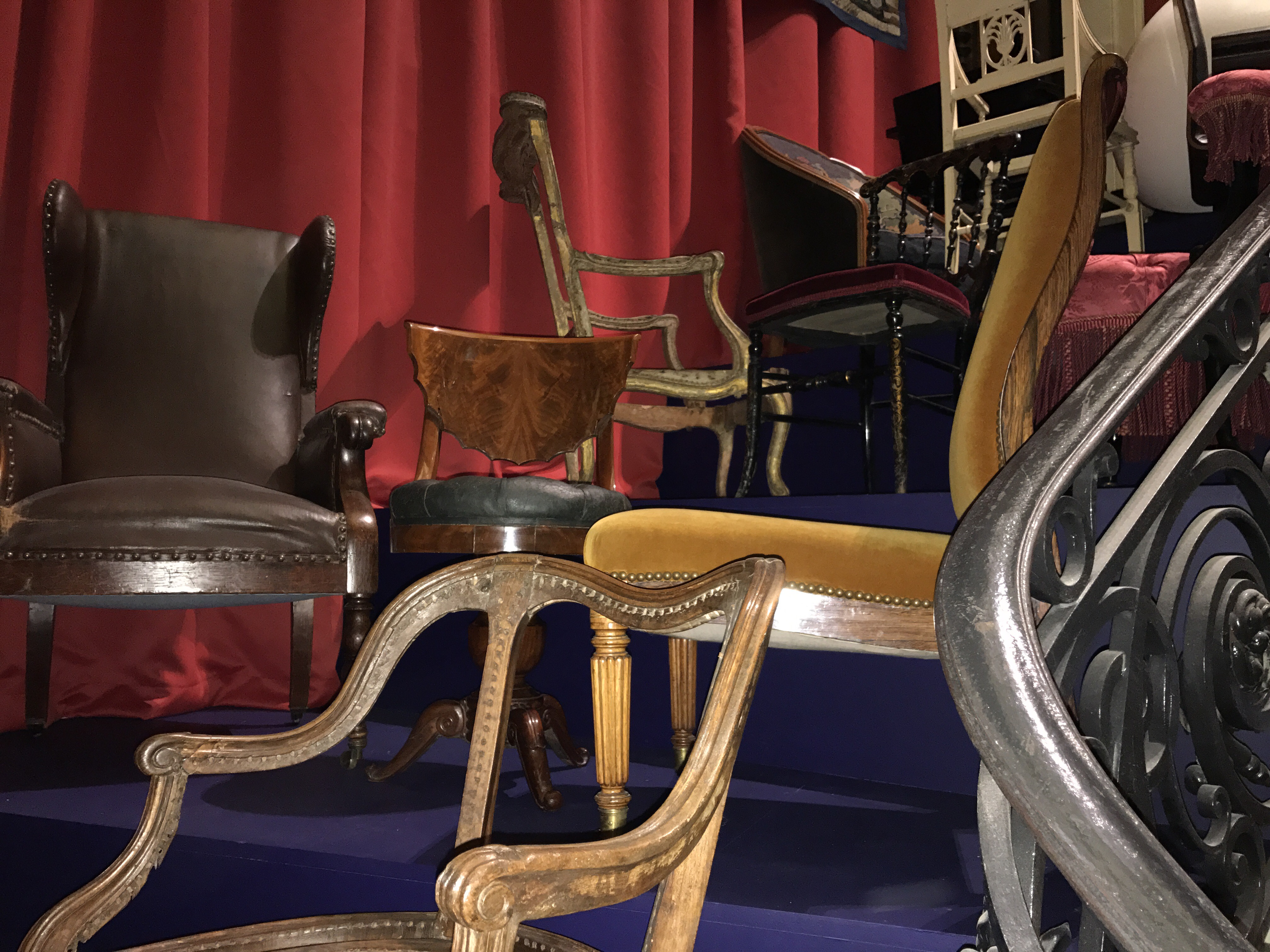 Les quelques 260 sièges proviennent d’une collection très riche du Mobilier National. Ce partenariat permet à l’exposition de présenter aussi bien un fauteuil de représentation réalisée par Bellangé pour le roi de Rome aux Tuileries en 1814 qu’un rocking-chair ultra-moderne en bois de merisier réalisé par l’Atelier de recherche et de création du Mobilier National moulé comme un ruban !