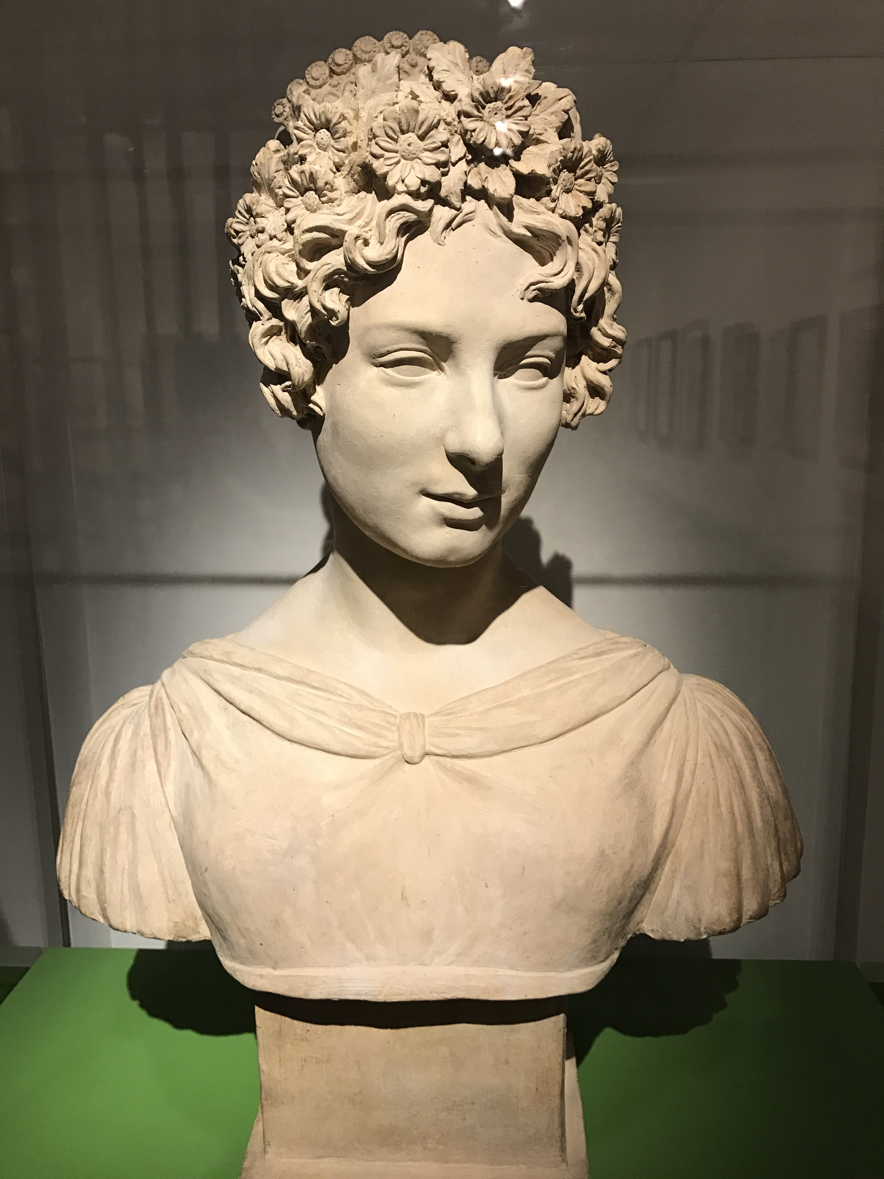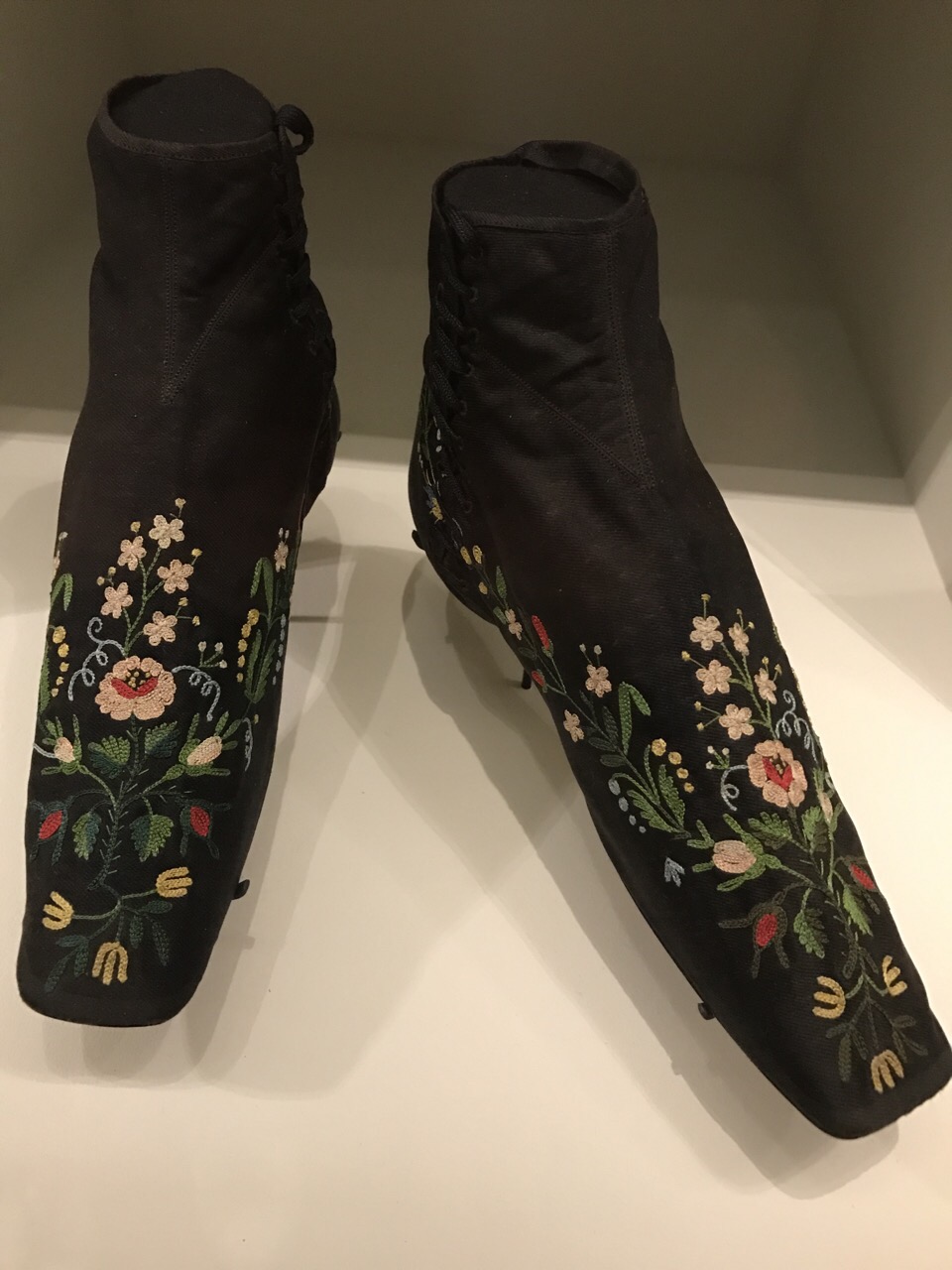 La partie consacrée à la Mode des fleurs nous a particulièrement conquise ! On découvre dans une autre pièce qu’à l’époque de la Restauration, les fleurs à la mode sont surtout le dahlia et la rose trémière. Les chroniques mondaines rapportent ainsi en 1881 : « Les salons de la Chaussée d’Antin sont autant de serres où sont rassemblées les plantes. Chaque année ôte à une fleur la vogue qu’elle donne à une autre ». A tel point que les fleurs envahissent le quotidien des gens bien nés : services de tables, bottines « délicieusement désuètes », bijoux et portes bouquets rivalisent de délicatesse dans leurs motifs floraux. Il est alors de bon ton de sortir avec un bouquet « comme cueilli de son jardin de Meudon ou acheté chez Madame Prévost au Palais Royal », tellement charmant ! Et le Journal des Dames et des Modes confirme en 1823 cette nouvelle règle sociale: « Il sied à la promenade de tenir par convenance un bouquet de roses, d’heliotropes ou de violettes ».