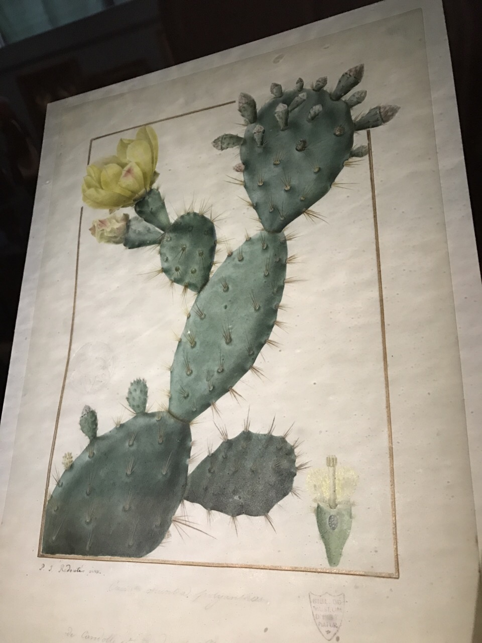 Entre science botanique et talent artistique, on voyage avec les savants et les dessinateurs vers les contrées lointaines d’Amérique et d’Australie pour découvrir, d’un oeil nouveau, des plantes jusque là inconnues en Europe. Tel fut le cas des cactus, des aloès et des succulentes d’Afrique du Sud dont les dessins et gravures, réalisés par Pancrace Bessa – le protégé de la duchesse de Berry -, sont exposées dans une première vitrine.