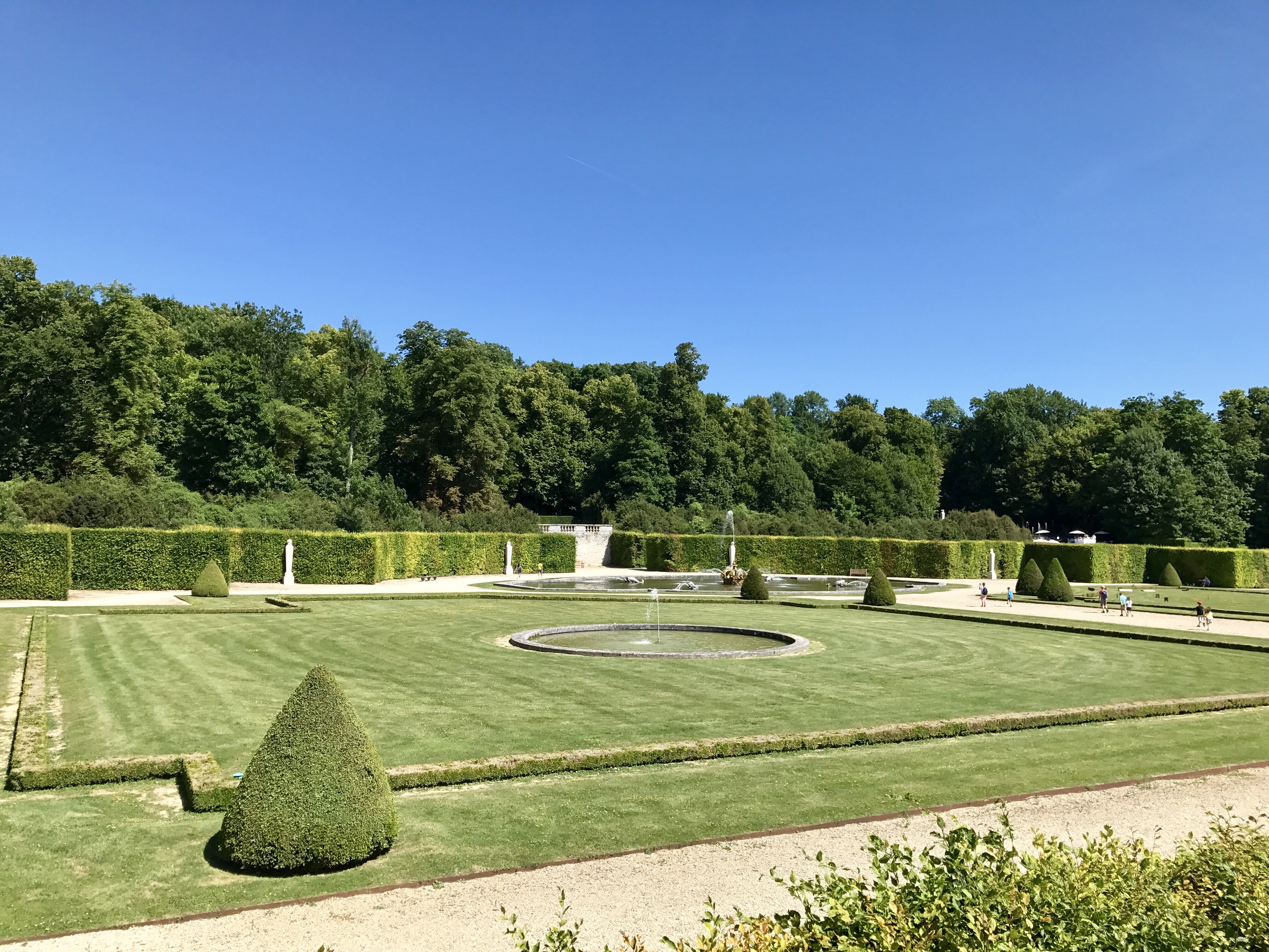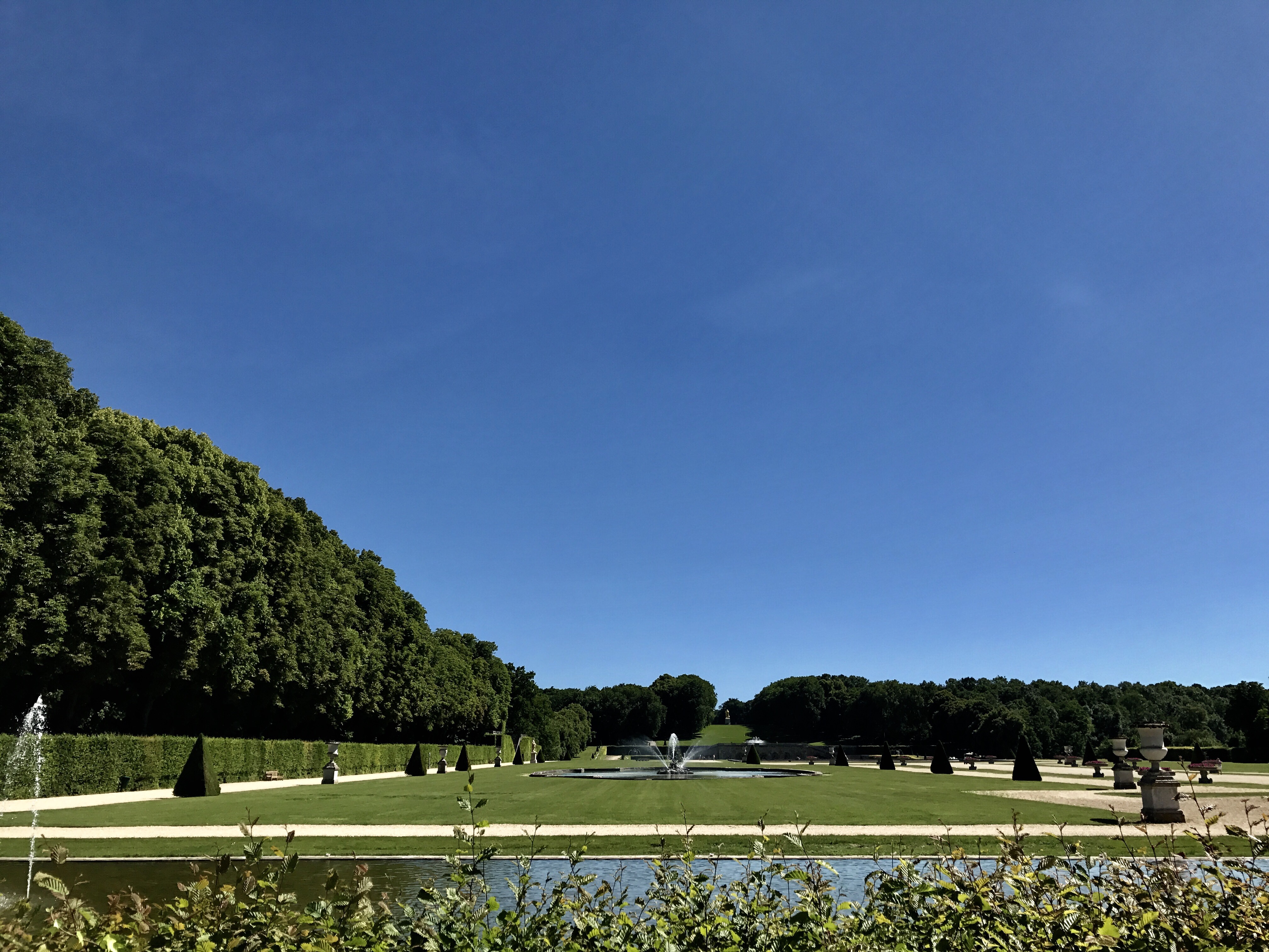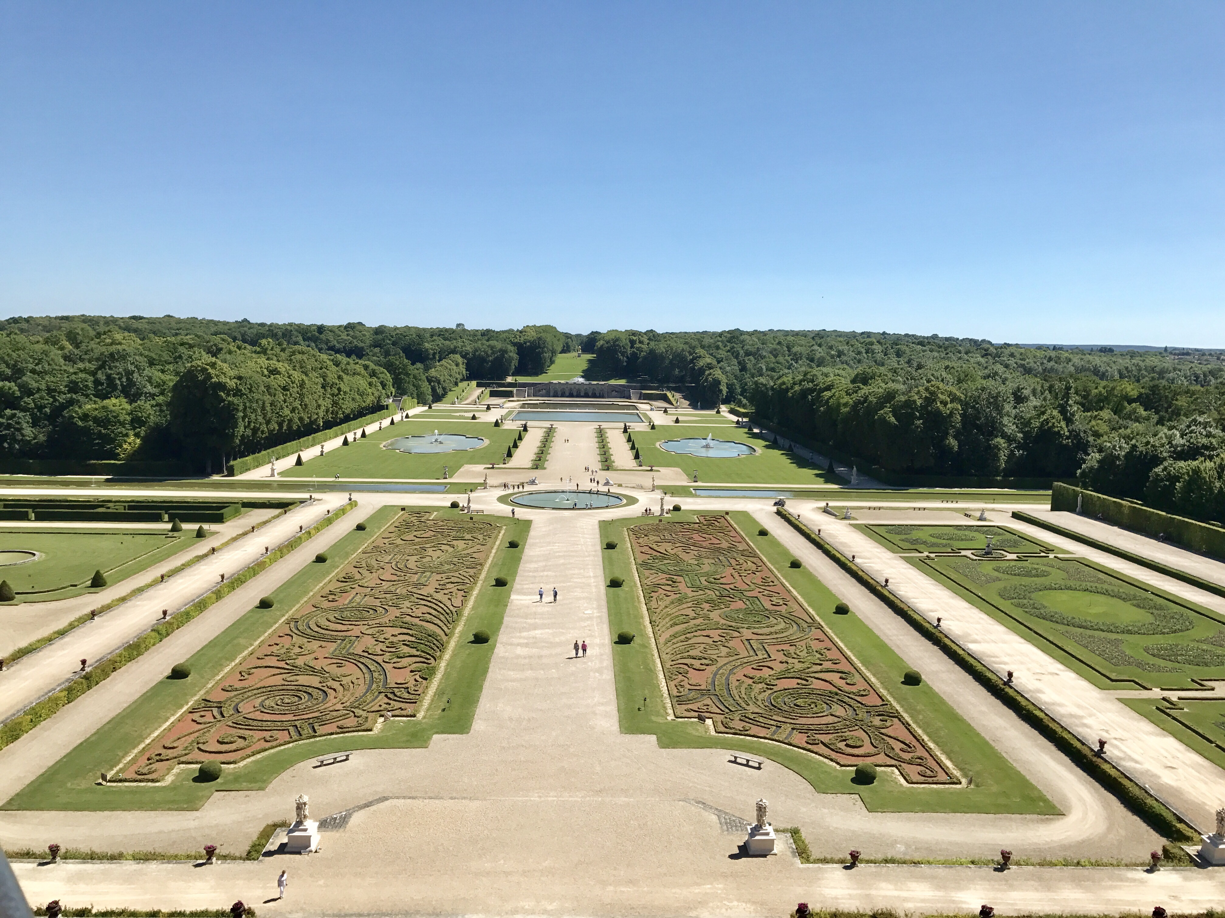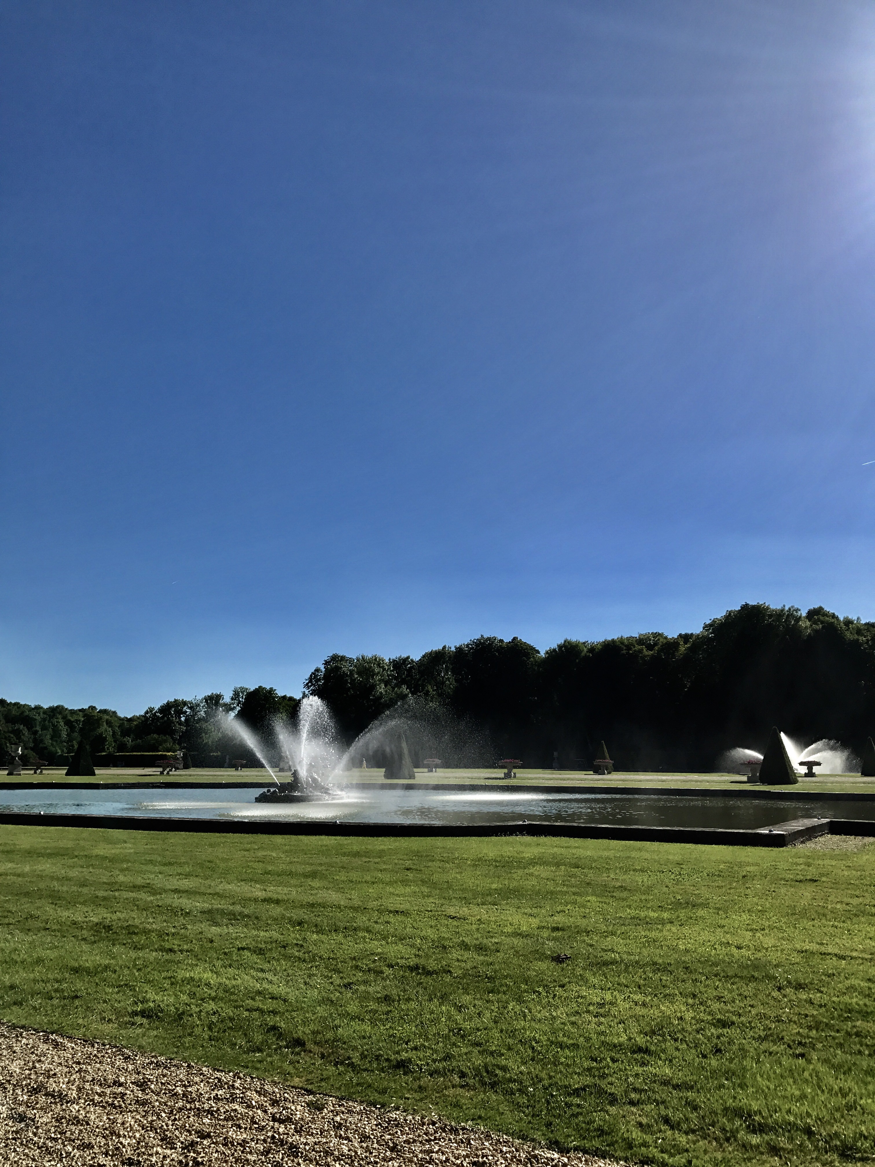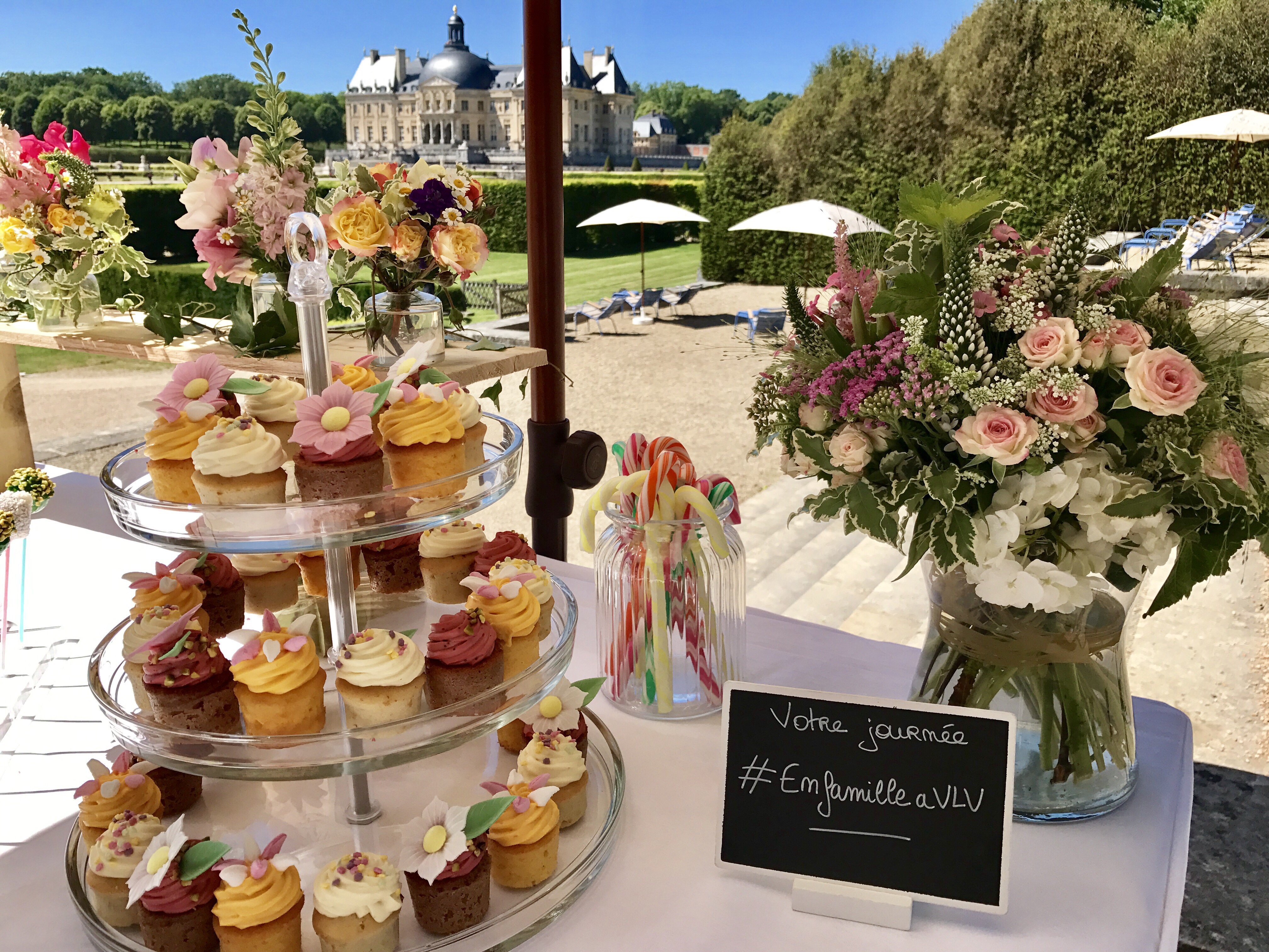 Promenons-nous dans les jardins…! Nous découvrons cette enfilade de verdure impeccablement taillée et ces fontaines fonctionnant selon le système d’antan et actionnées par des fontainiers (comme autrefois !) Magique ! Mais le clou de la visite fut surement ce goûter sur la terrasse « Au Songe de Vaux » : petits muffins, macarons, sucettes en chocolat et autres mignardises délicieuses signées de Florian, le chef pâtissier attitré du Château de Vaux-le-Vicomte, bar à champagne, smoothies, …