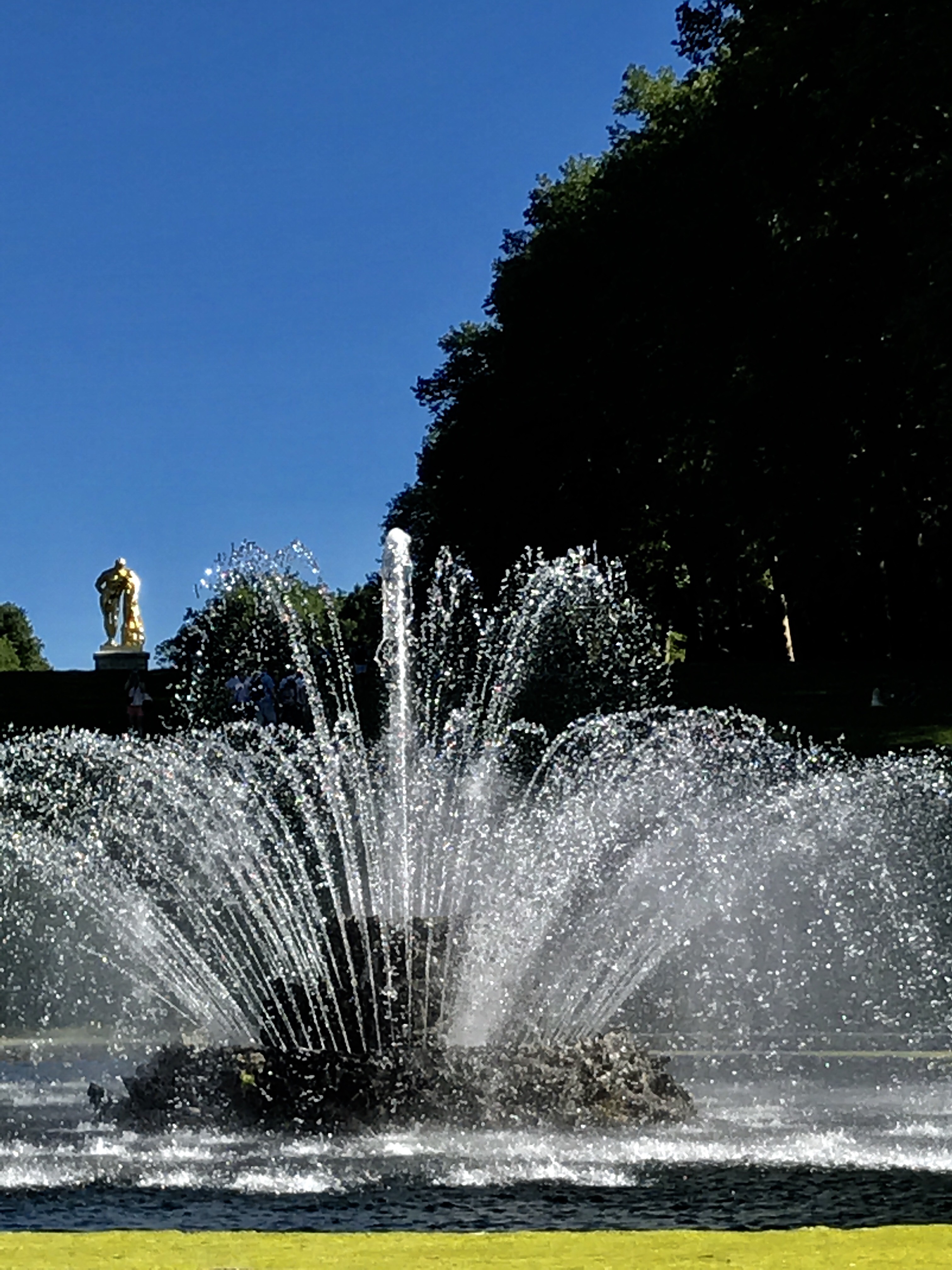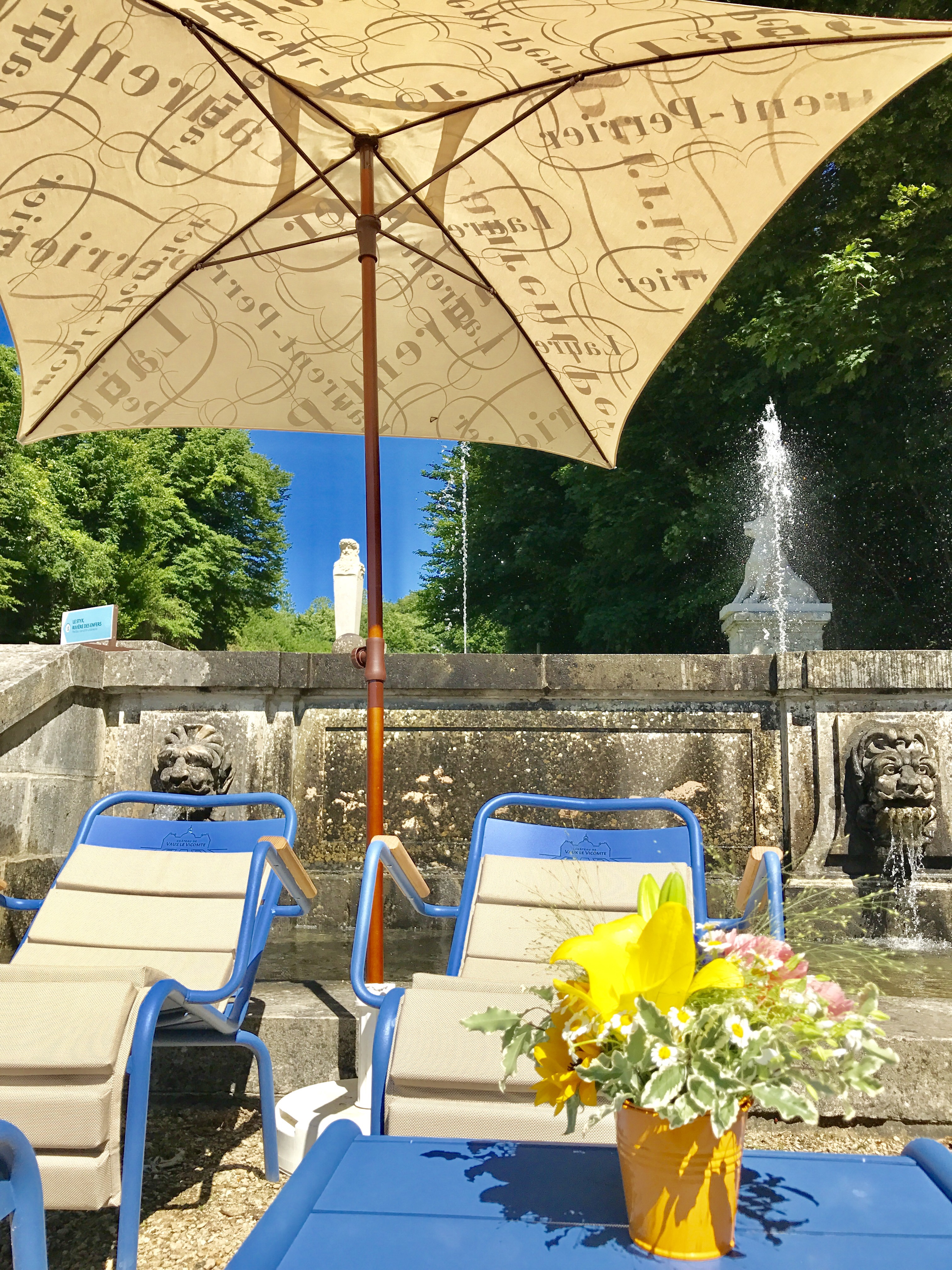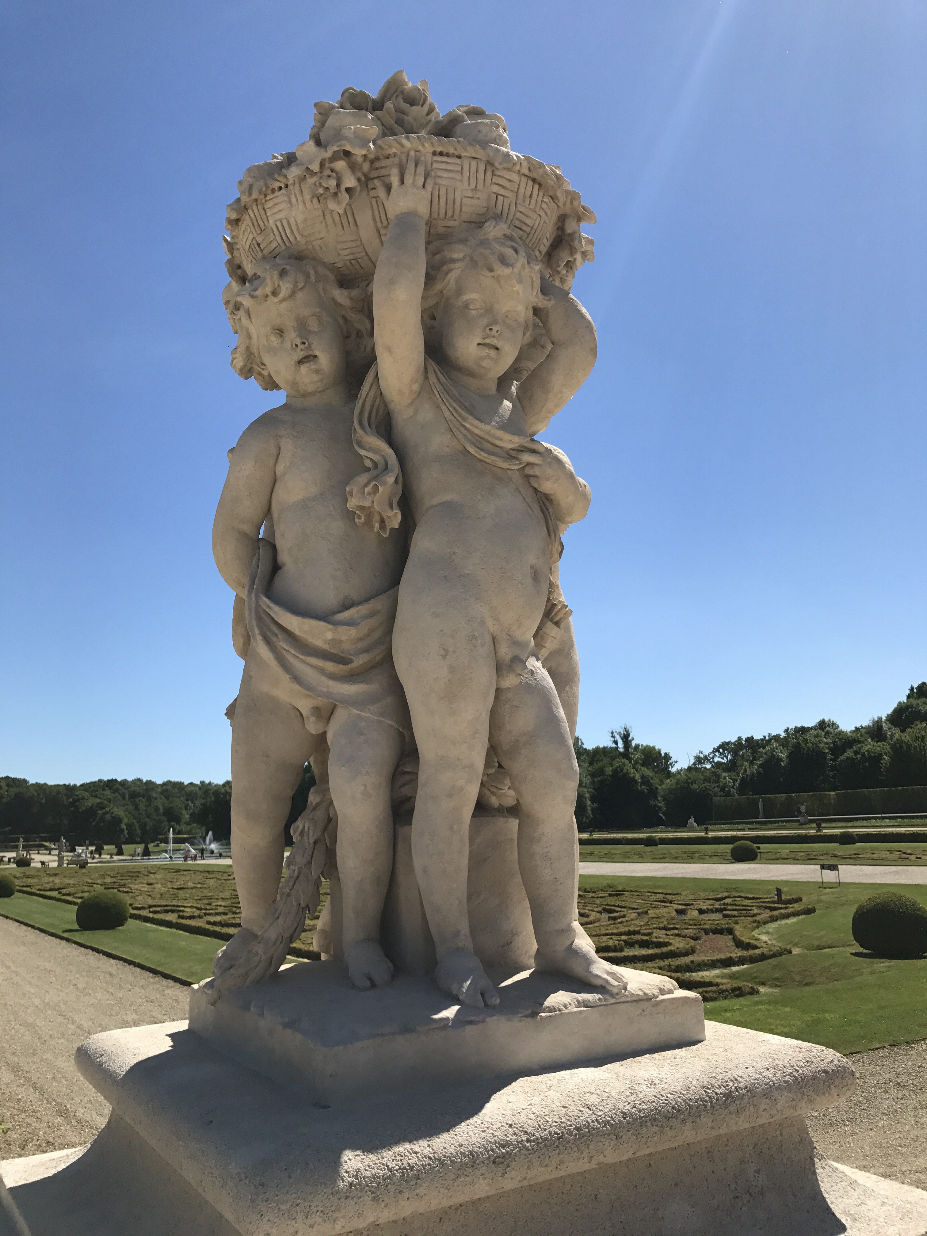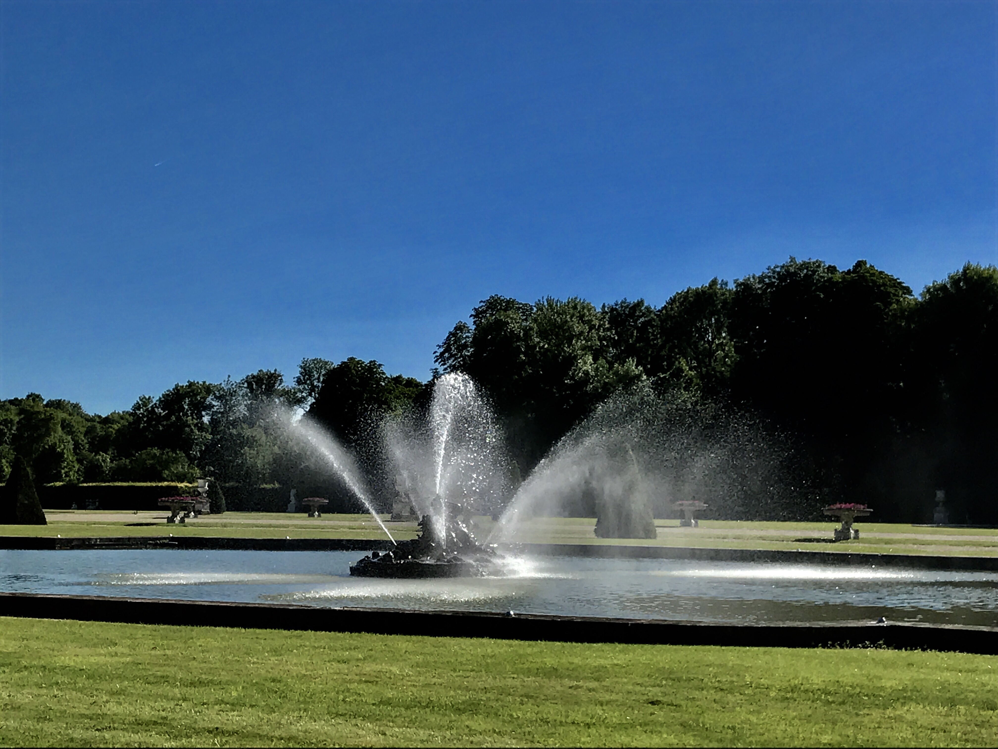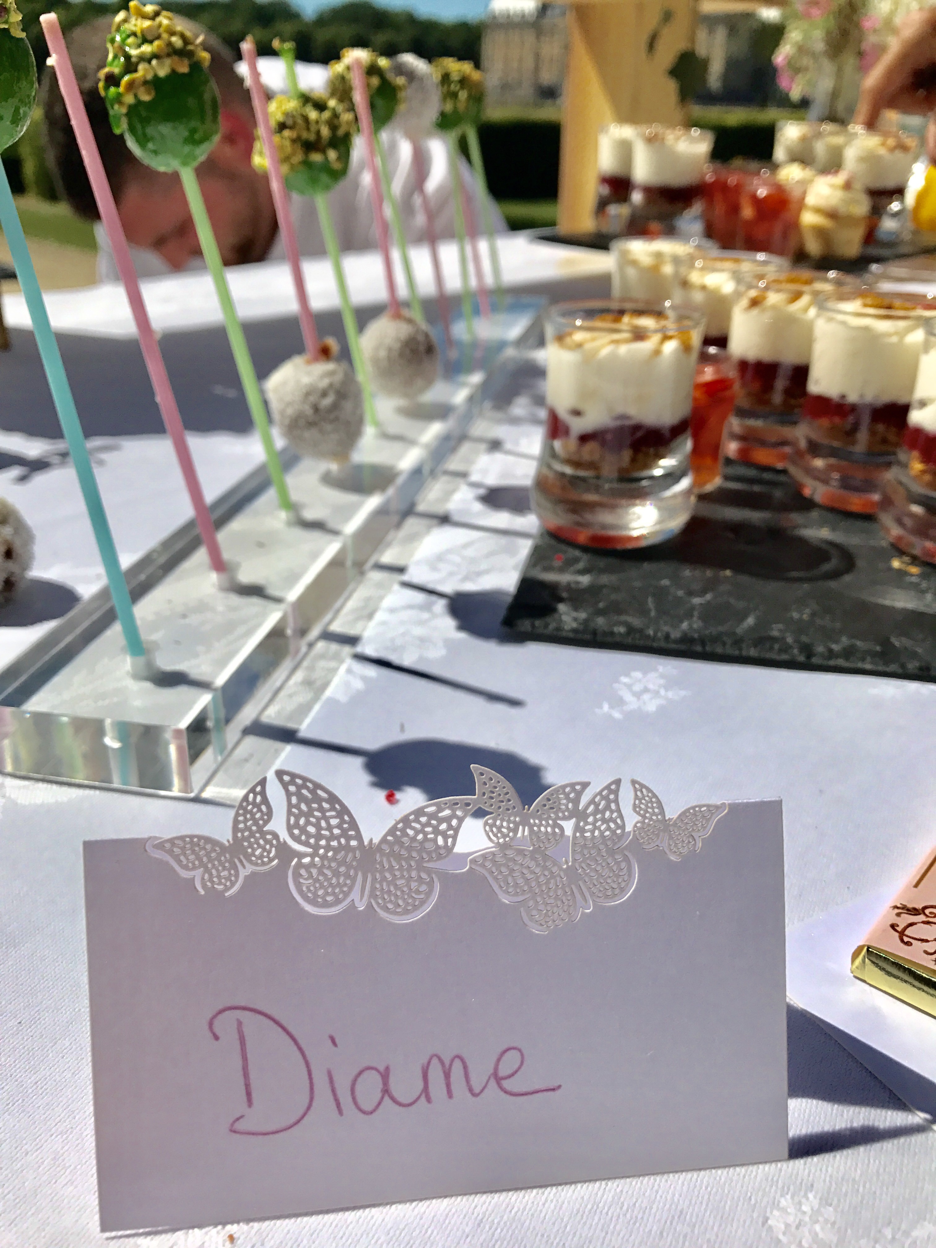 Promenons-nous dans les jardins…! Nous découvrons cette enfilade de verdure impeccablement taillée et ces fontaines fonctionnant selon le système d’antan et actionnées par des fontainiers (comme autrefois !) Magique ! Mais le clou de la visite fut surement ce goûter sur la terrasse « Au Songe de Vaux » : petits muffins, macarons, sucettes en chocolat et autres mignardises délicieuses signées de Florian, le chef pâtissier attitré du Château de Vaux-le-Vicomte, bar à champagne, smoothies, …