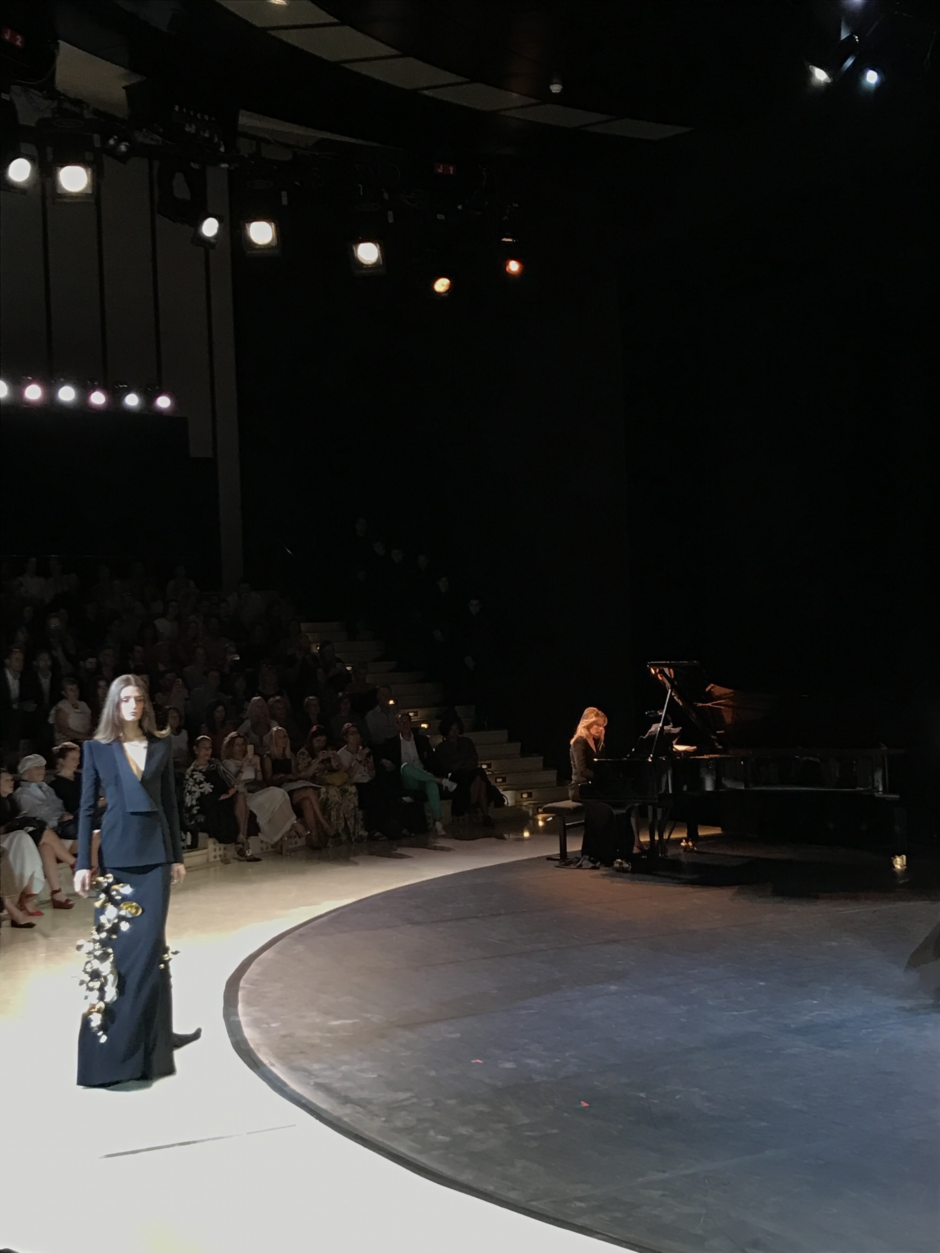 Pourquoi on aime ? Parce que, avec Stéphane Rolland, la Parisienne s’approprie à merveille une culture ancestrale, presque tribale. En effet, les manteaux, combinaisons pantalons et tuniques trapèzes sont généreux, amples en ronds. Ils ont la force de la simplicité et la richesse de leurs ennoblissements. Tout est brodé d’éléments en lévitation qui cadencent le pas.