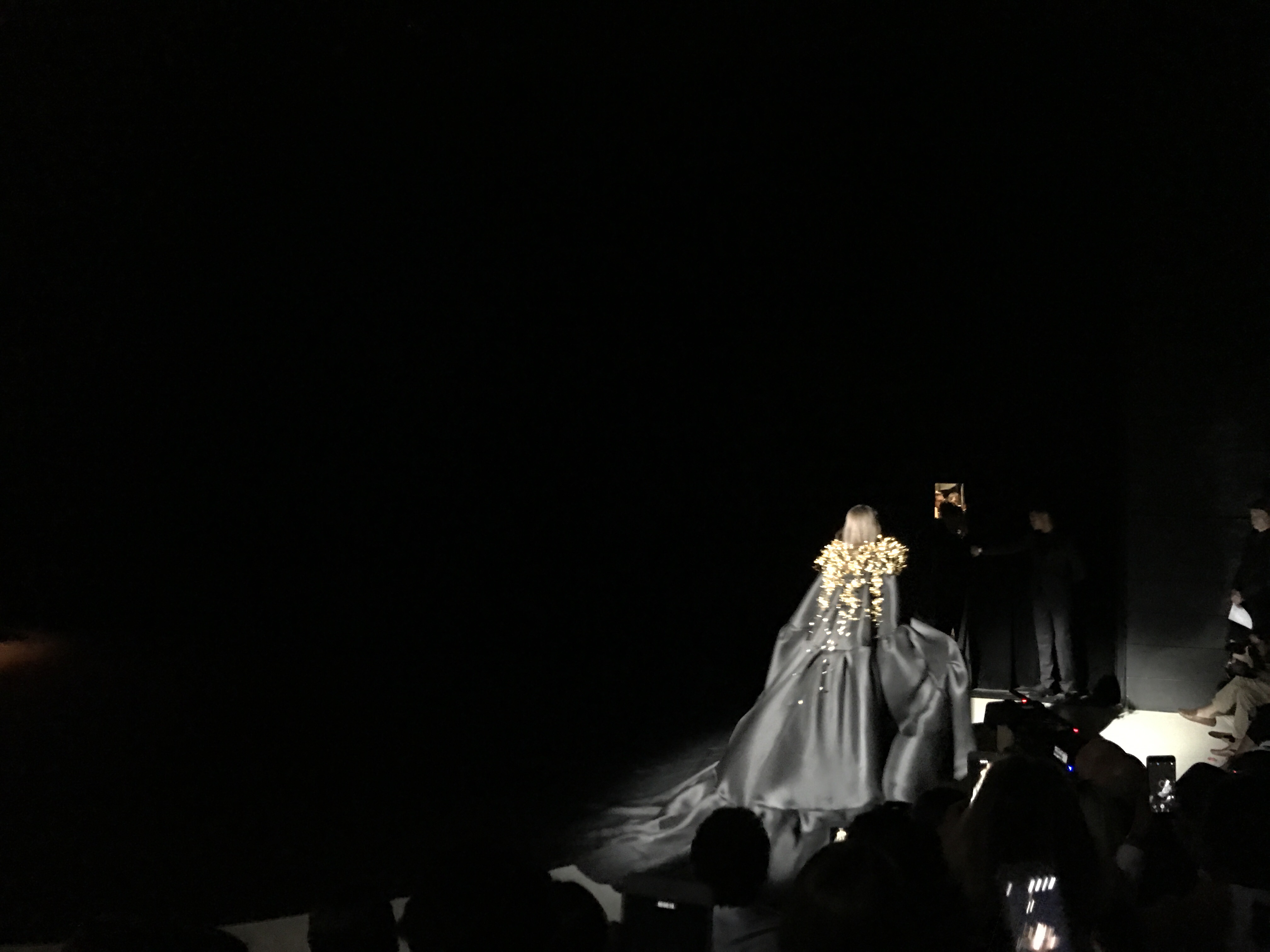 La femme de Stéphane Rolland est puissante et séduisante mais reste élégante et subtile. Rien dans ces pièces sublimes n’est frontal ni offert : tout est à découvrir. Sur une robe cape de crêpe noir aux épaules pagodes se greffent des branchages dorés, une des nombreuses réinterprétations des oeuvres du duo américain Kurt Freiler et Jerry Fels. Quant à la robe totem, droite, à la traine cubique et brodée d’une colonne de visages en silicone or oxydé, elle est un hommage vibrant au sculpteur autrichien Franz Hagenauer.