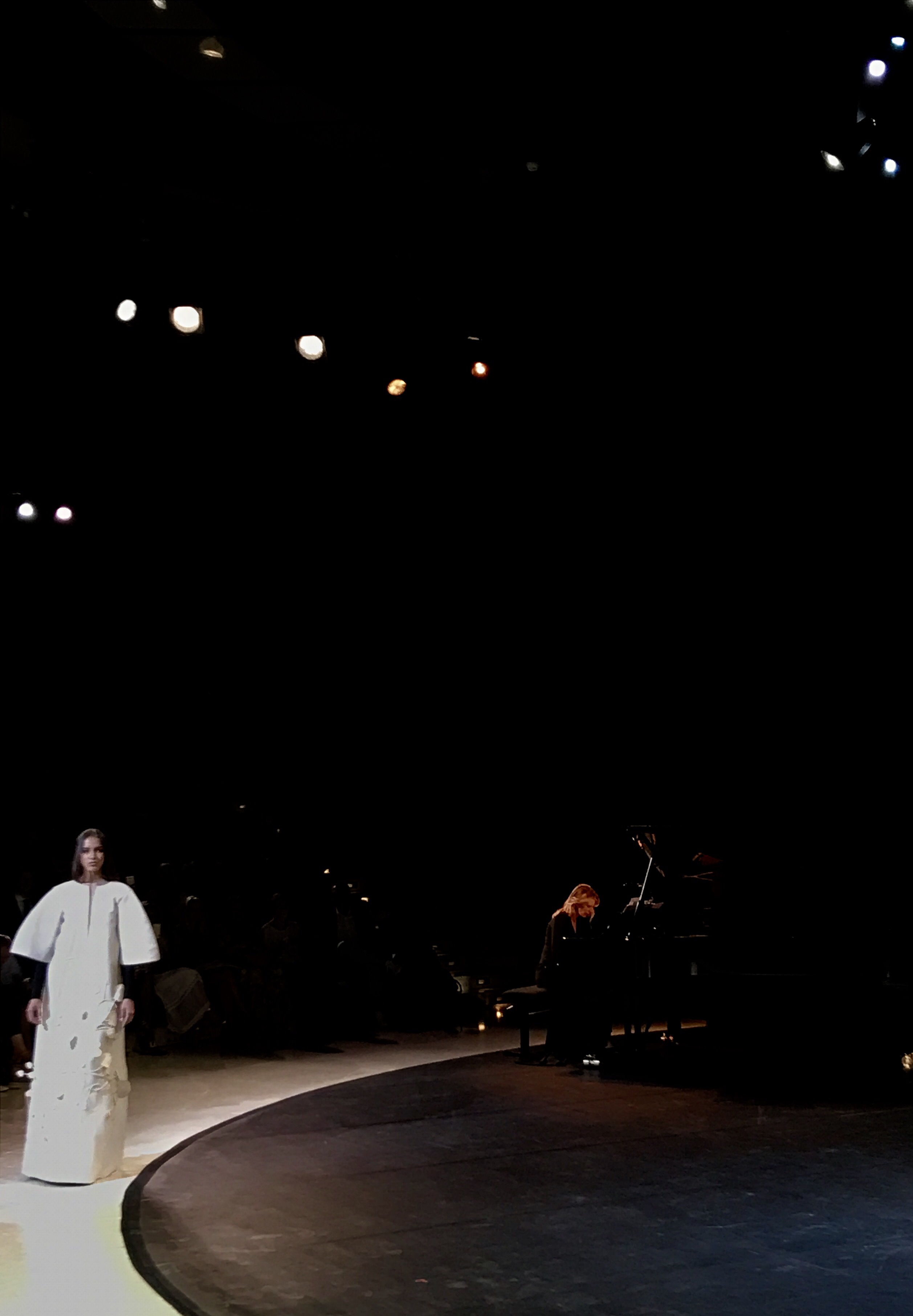 Une seule couleur, l’ocre des terres d’Afrique, vient perturber les noirs et blancs d’une robe corolle aux immenses brassards. Jouant comme toujours depuis dix ans avec les effets de contrastes et de mouvements, Stéphane Rolland défie encore mieux l’espace, nous surprend et crée l’émotion – à l’instar de ce pull en crêpe mousse blanc dont la volée de gazar noir vient briser magistralement l’épure de cette silhouette infinie…