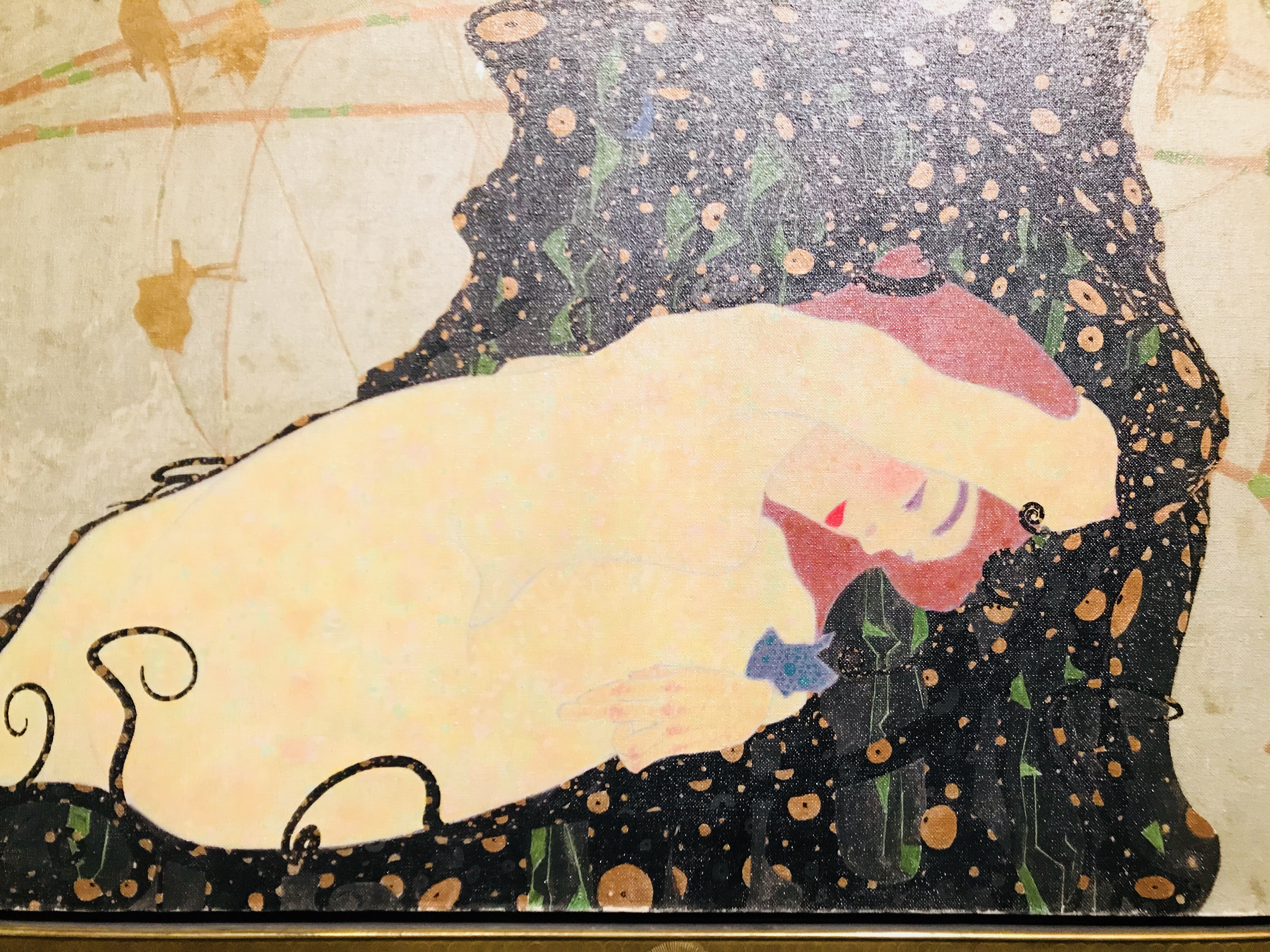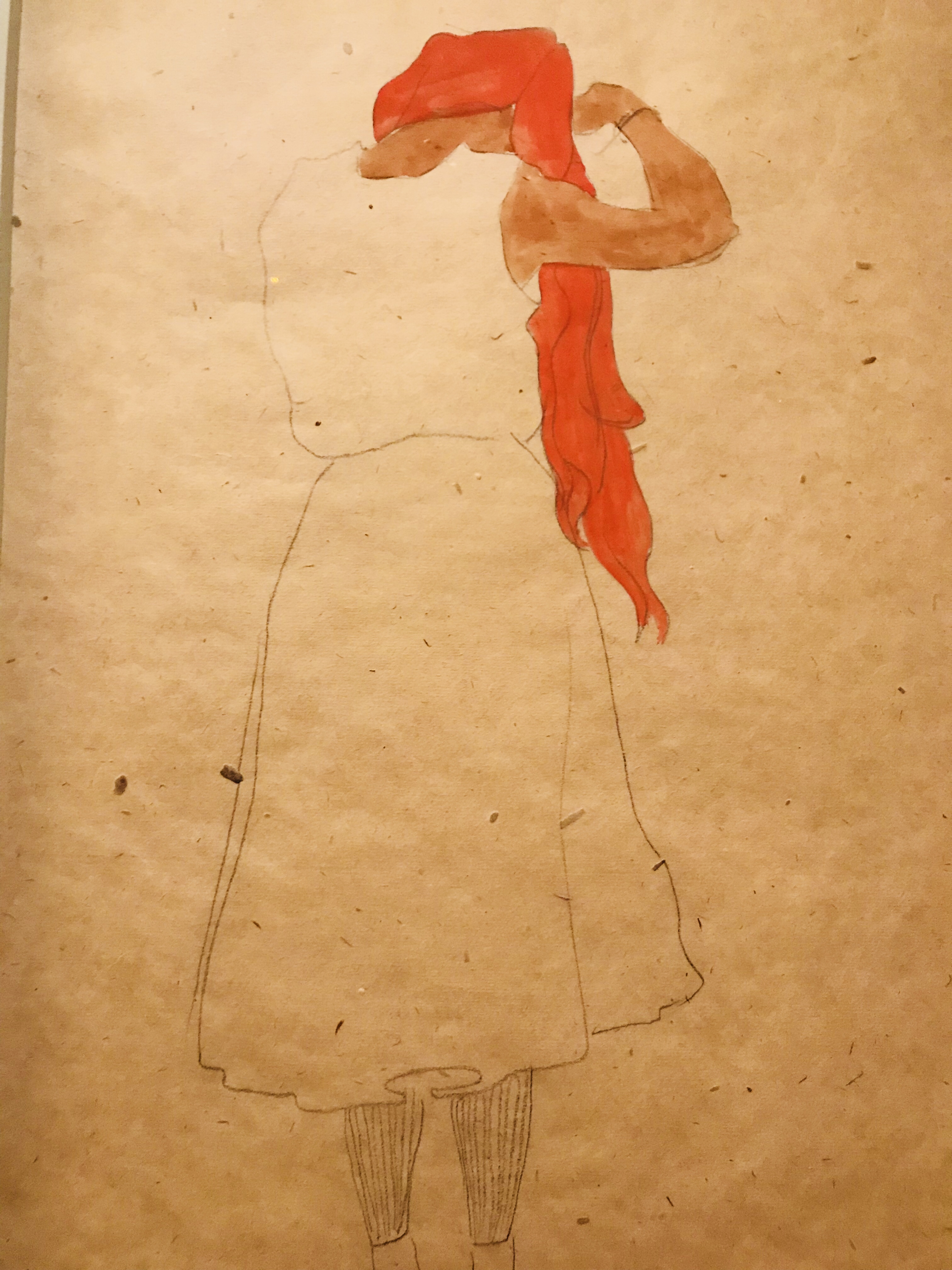 Pourquoi on aime ? Parce que cette exposition est une explosion de couleurs. Du début à la fin, de la première galerie à la neuvième, les camaïeu stridents font légion. D’un côté, les lignes expressives et les harmonies artistiques d’Egon Schiele servent la cause des formes … Des formes aigües, nerveuses, cassées qui traduisent l’obsession du peintre autrichien pour les corps, les marionnettes, et pour son propre corps. A la plume, à la gouache, au crayon, Egon Schiele dessine des visages au masque cadavérique, des doigts étirés et écartés à l’extrême. Mais, d’une réalité malmenée, l’artiste nous conduit peu à peu vers des oeuvres aux volumes plus adoucis …