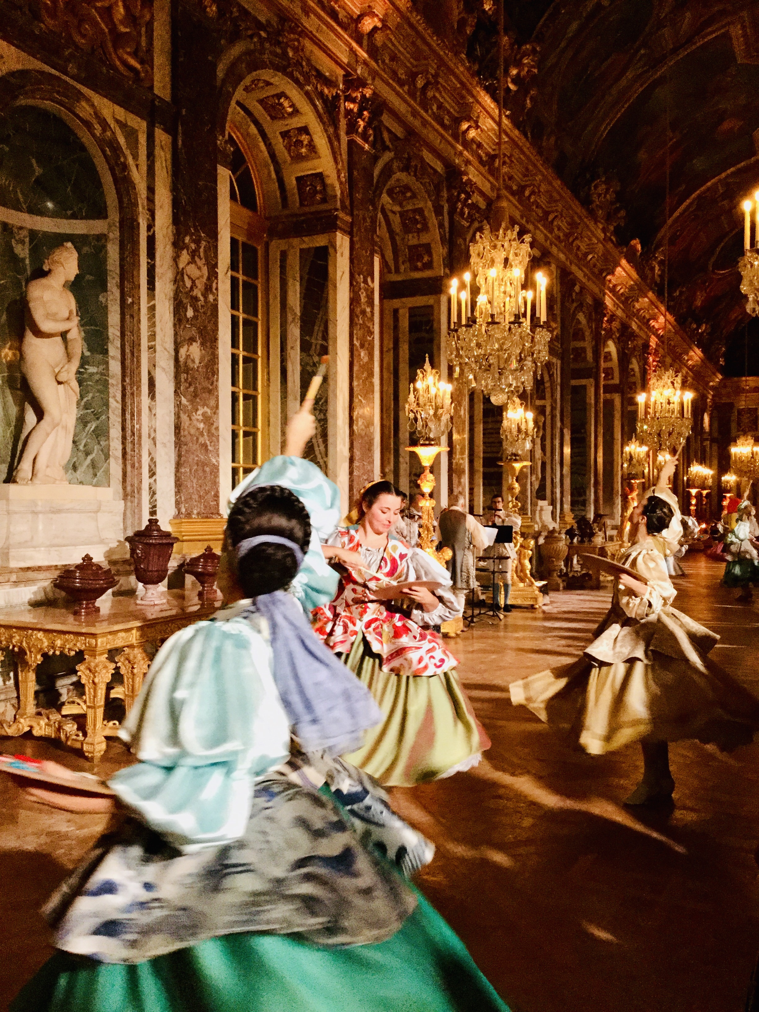 Parcourant les salles (Salon d’Hercule, Galerie des Glaces, salle 1792 et Galerie des Batailles), nous sommes plongées dans l’ambiance de cour rythmée par la musique et la danse baroque. Envoûtant.