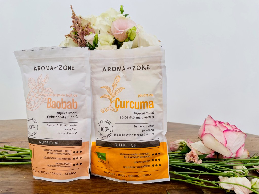 Energisants, nourrissants pour la peau et pour le corps, les produits présentés par Aroma-Zone nous apporteront en effet tous les bienfaits dont nos organes et nos muscles auront besoin pour reprendre notre routine quotidienne… Parfait allié pour harmoniser notre bien-être, chaque super-aliment choisi avec soin selon ses objectifs boostera donc notre immunité grâce à quantité de nutriments, d’antioxydants, d’enzymes, de minéraux, de vitamines, de fibres, d’acides gras essentiels, de protéines …