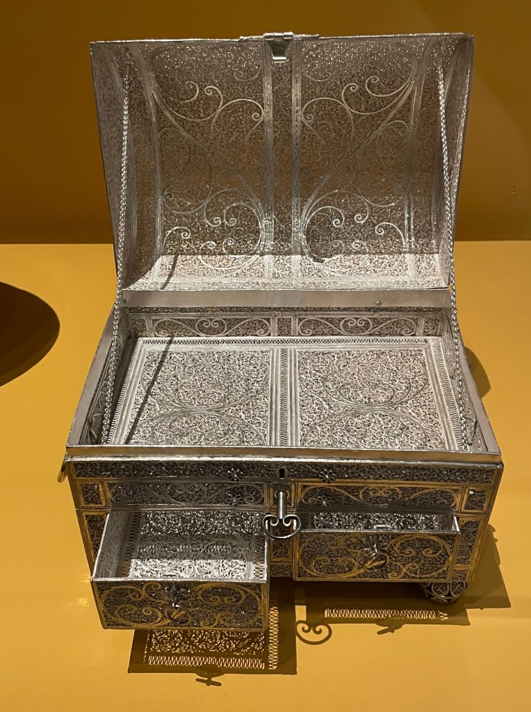 Le Musée du Luxembourg offre aux Parisiens une étrange expérience à la découverte d’oeuvres exceptionnelles précieusement collectionnées par les Princes électeurs de Saxe. En effet, entre le XVIè et le XVIIIè siècle, étaler aux yeux du monde des possessions éclatantes de richesse et d’exotisme se révélait être une des marques les plus évidentes de la puissance et du pouvoir…. Ainsi nous sont présentés quelques extraits (les plus beaux sans doute !) de la fameuse « Voûte Verte », une merveilleuse galerie que le prince Auguste le Fort, grand amateur d’art et de sciences aménagea, pour y disposer ses trésors… et dès 1723, le prince transforma sa collection personnelle en musée public – l’un des tout premiers d’Europe.